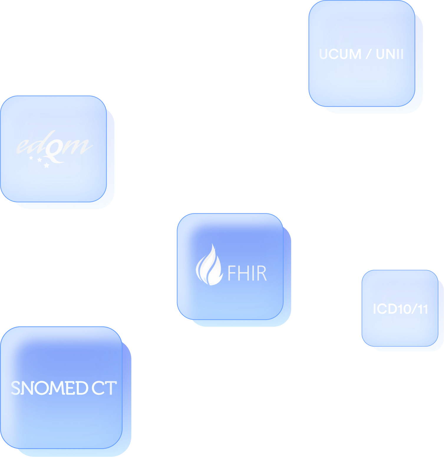 SNOMED-CT en socle, avec une structuration multi-terminologies : ICD-10/11, ATC, EDQM, UCUM, UNII.