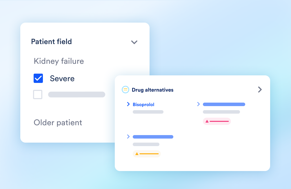 Analyse en temps réel qui croise le traitement envisagé avec le profil complet du patient : fonction rénale, âge, grossesse, comorbidités, traitements en cours. Alertes finement contextualisées et suggestions pertinentes d’adaptation des prescriptions.